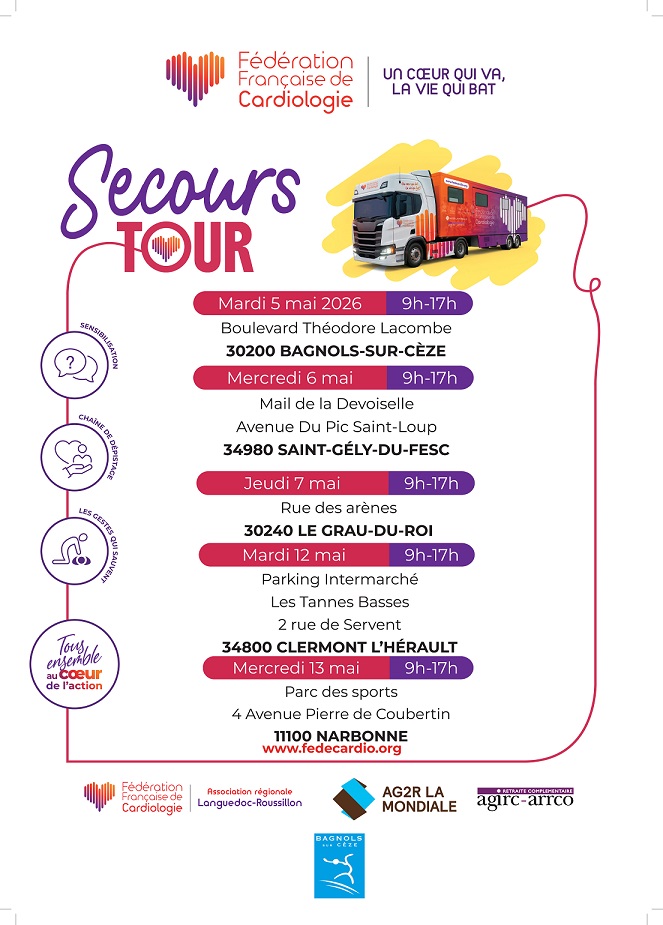 Face à l’importance des maladies cardiovasculaires, première cause de mortalité en France, la prévention et le dépistage précoce sont essentiels. C’est dans cette optique que la Fédération Française de Cardiologie lance le Secours Tour, une campagne itinérante de sensibilisation et de dépistage qui sillonnera plusieurs villes du Languedoc-Roussillon au mois de mai.