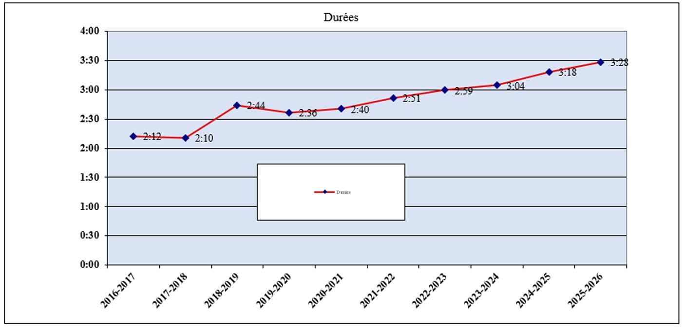 | 2025 – 2026 | 15 | 20 | 133 Km | 8,9 Km | 49 h 48 | 3 h 19 | 3 441 m | 229 m | 5,2 % |
