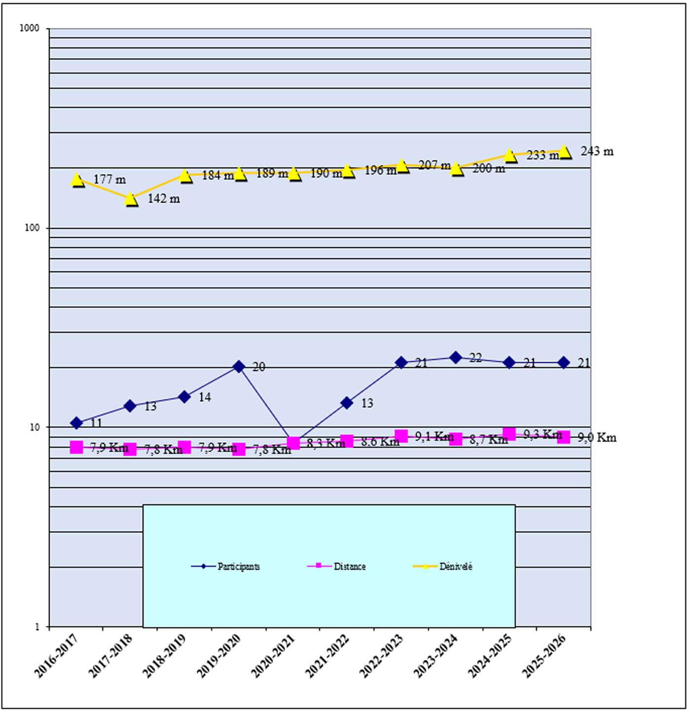 Depuis sa création, cette activité, animée par plusieurs équipes successives, a néanmoins connue une certaine continuité dans son évolution. on notera juste une nette diminution du nombre de participants dans les groupes de marcheurs au plus fort de la crise sanitaire. La tendance observée actuellement est une légère diminution de la vitesse moyenne de marche, diminution probablement due à l’augmentation du nombre de participants (fréquence des regroupements et temps de récupération du rythme cardiaque) ainsi que la tendance à faire des marches avec des dénivelés plus importants..