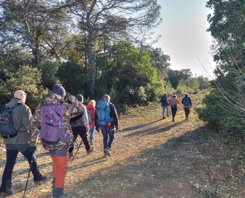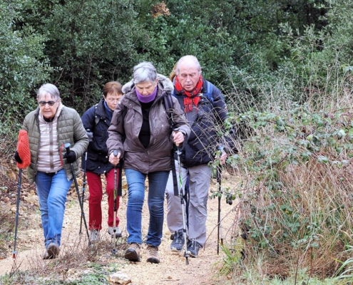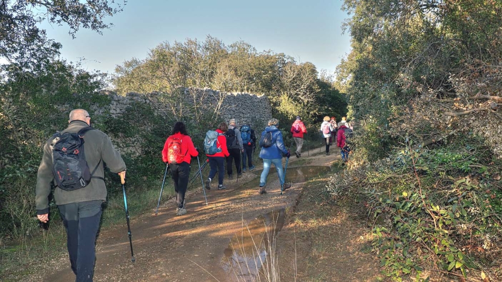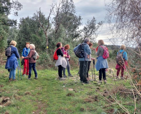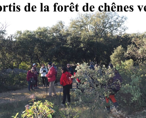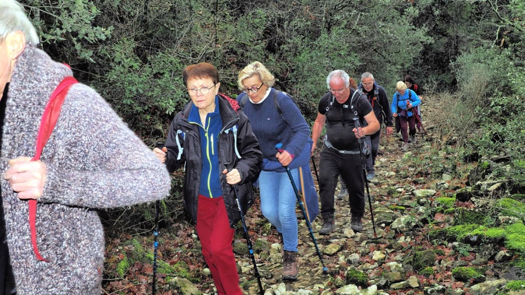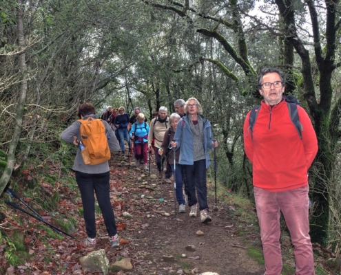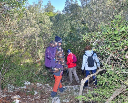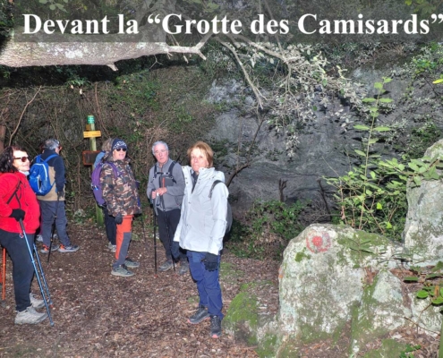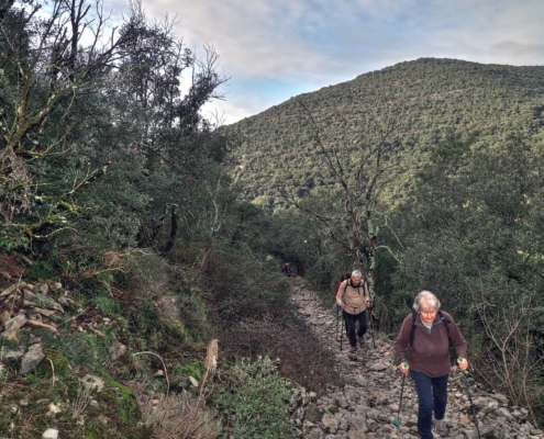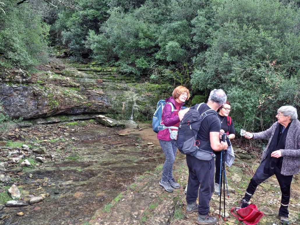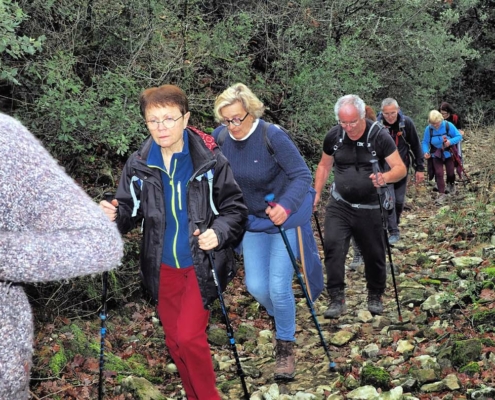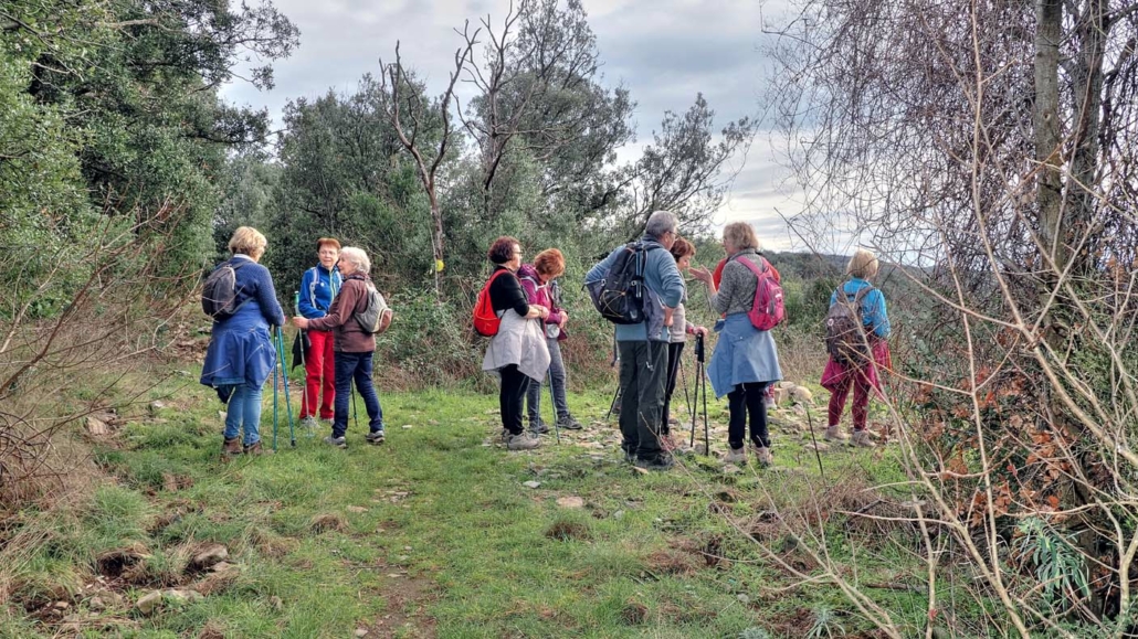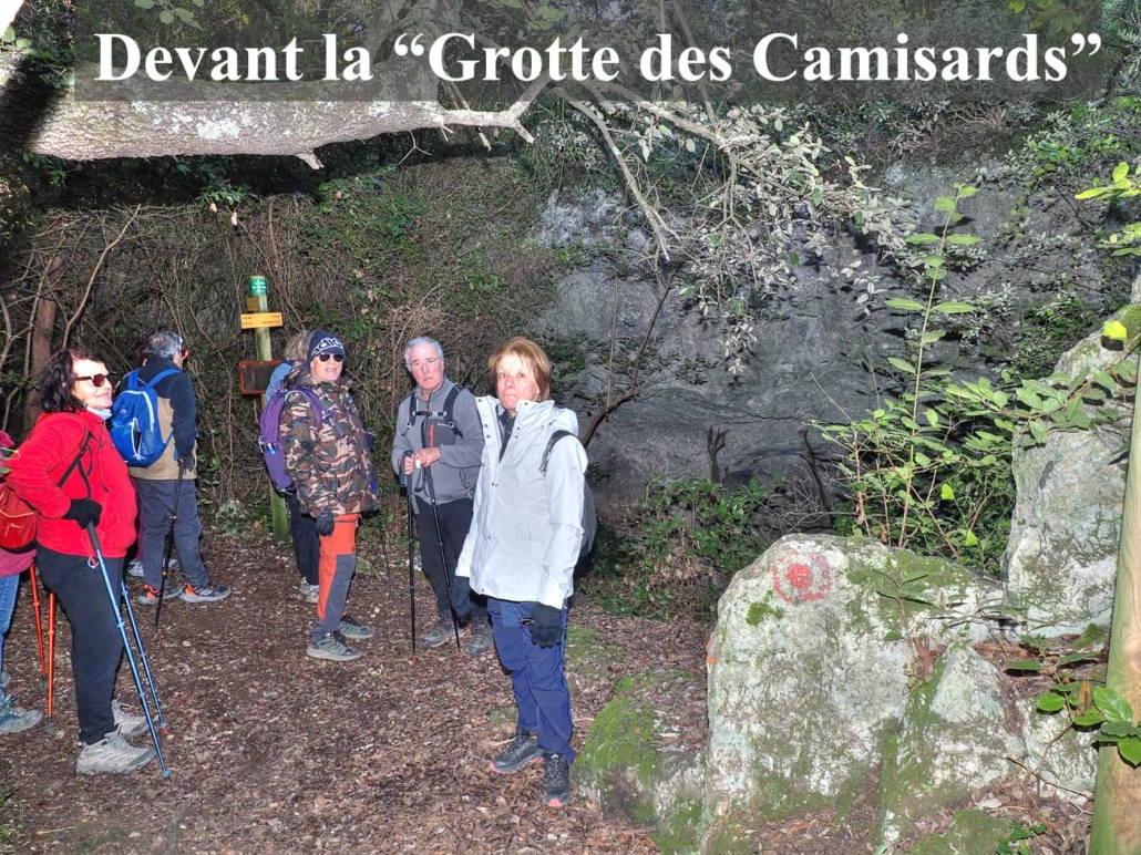 L’après-midi le groupe se scinde en deux : ceux qui ont choisi la version « cool » continueront sur la voie verte avec quelques variantes d’observation et au retour une autre rallonge vers St Hippolyte du Fort pour faire un peu plus long et ne pas avoir à attendre trop longtemps le deuxième groupe qui avait opté pour la version « hard », avec montée au Ranc de Banes et retour vers la voie verte après avoir traversé la « Baume Clauside », sorte de grotte à deux entrées qui permet de franchir un « à-pic » des falaises.